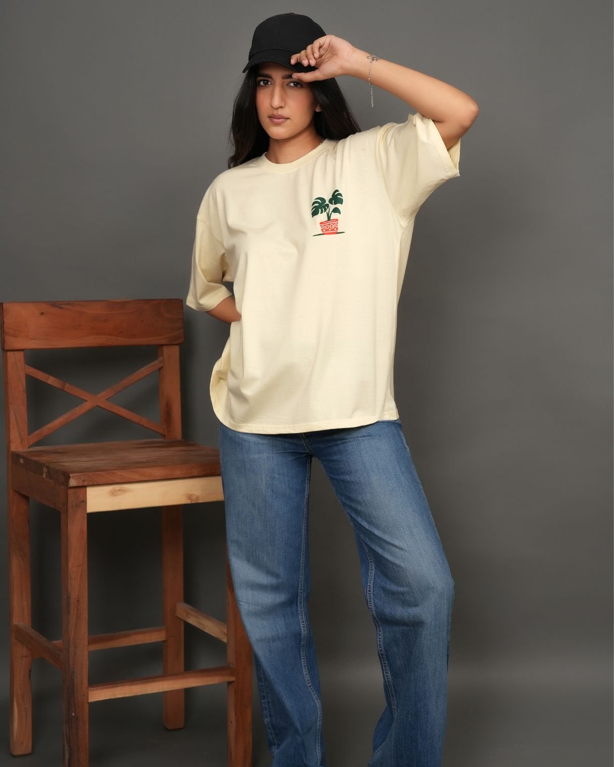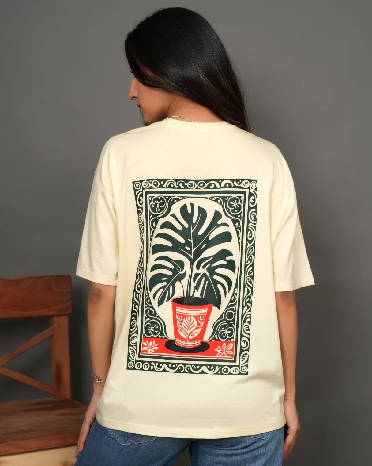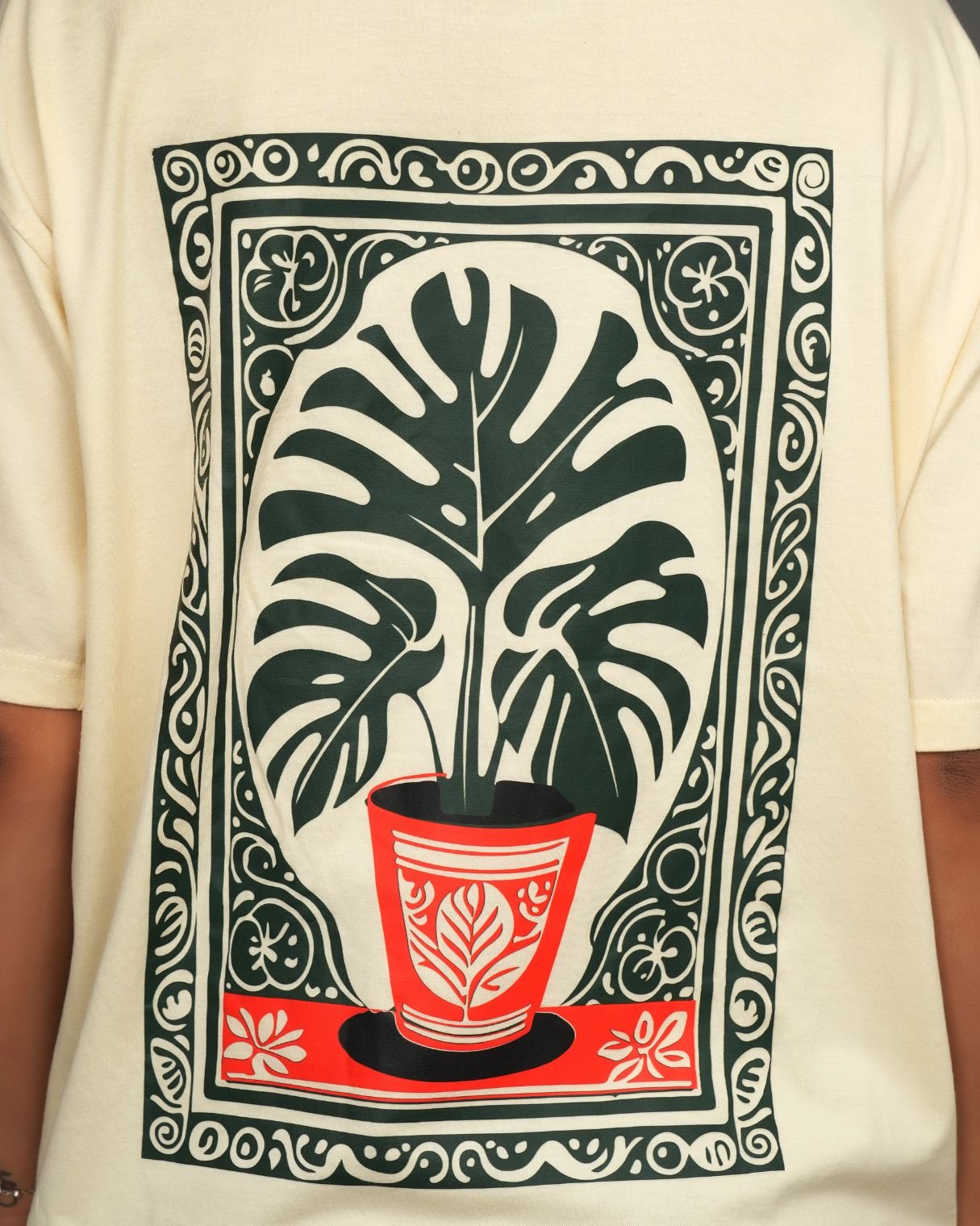Crafted from premium cotton, it offers a soft, breathable feel with a structured oversized silhouette that drapes effortlessly. The framed botanical artwork adds a gallery-like aesthetic — subtle from the front, striking from the back.