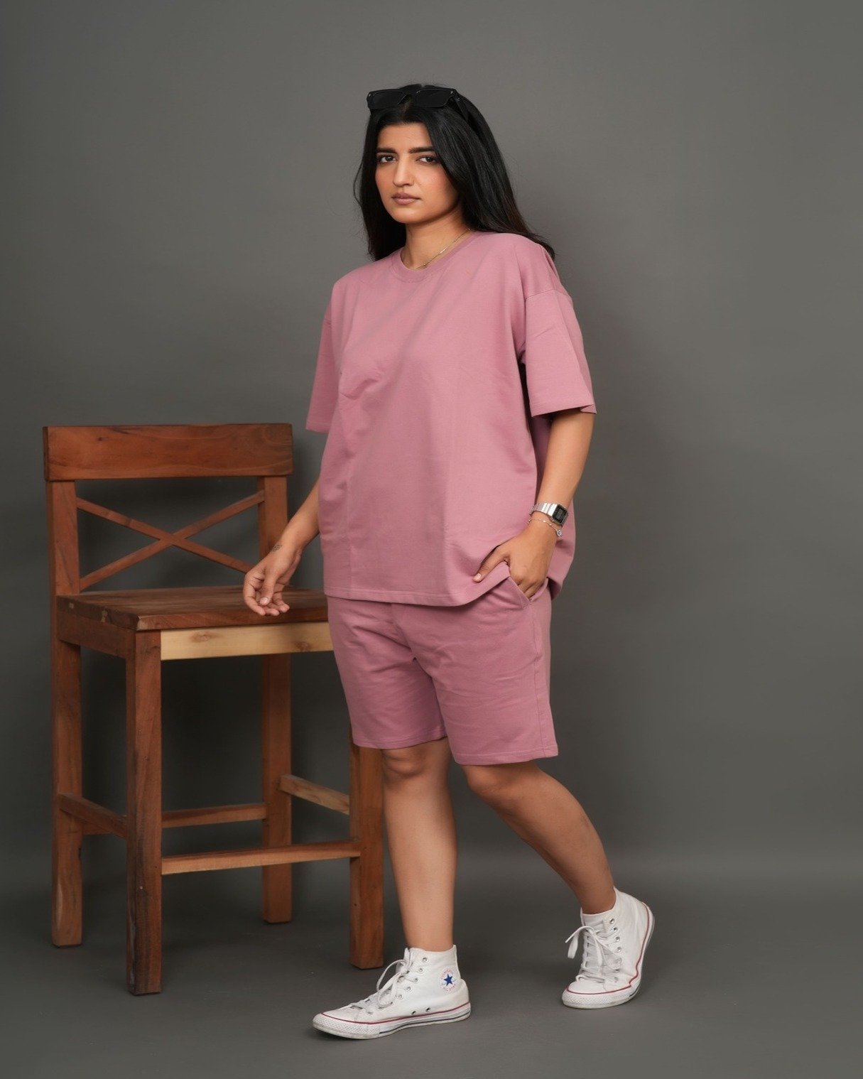 The oversized T-shirt paired with relaxed-fit shorts creates a sleek, modern aesthetic ideal for travel, lounge, and elevated casualwear.