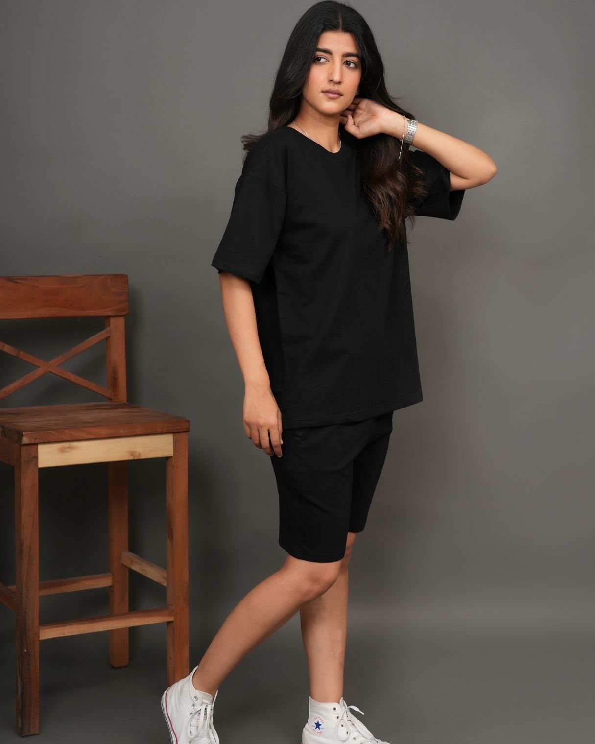 The oversized T-shirt paired with relaxed-fit shorts creates a sleek, modern aesthetic ideal for travel, lounge, and elevated casualwear.