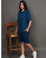 The oversized T-shirt paired with relaxed-fit shorts creates a sleek, modern aesthetic ideal for travel, lounge, and elevated casualwear.